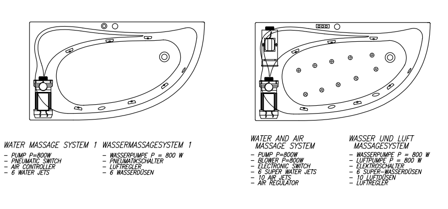 Система гідромасажу працює таким чином: водяний насос створює тиск і приплив води через масажні сопла, які спрямовують струмінь води змішаний з повітрям. Тисяча повітряних кульок з великою швидкістю води інтенсивно масажують людину. Приплив води контролюється відмірянимнадходження повітря в масажні форсунки.