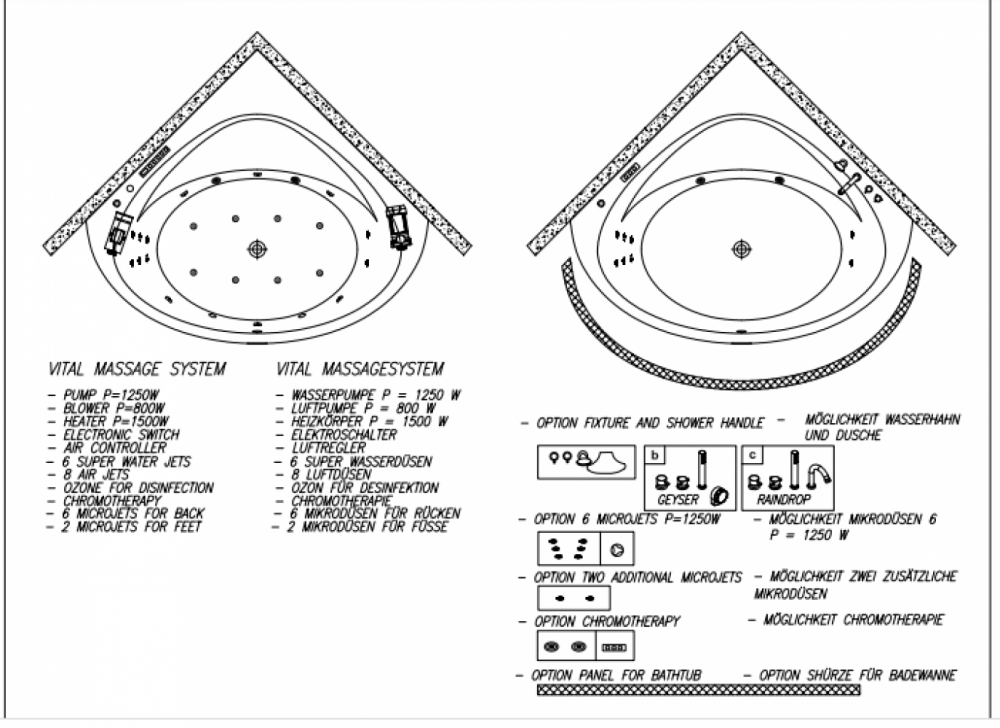 Ванна зібрана на каркасі зі зливом-переливом із встановленою панеллю, з масажною системою VITAL + MIKRO (мікрофорсунки для масажу спини), електронним управлінням. b>
