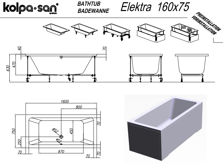 1) Ванна акрилова Kolpa San Elektra 160х75 см/О з комбінованою (повітря+вода) масажною системою+MIKRO та панеллю білий