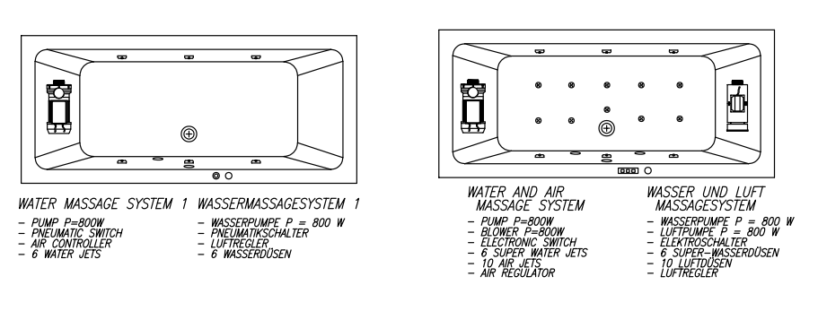 Всі елементи системи водно-повітряного масажу об'єднані у комбіновану систему. Одночасна діяльність обох систем інтенсивно впливає на організм людини, повністю регенерує та розслаблює його. Система аеромасажу працює за рахунок повітряного насоса, що створює підвищений тиск і потік повітря через масажні форсунки. Струмені розбивають повітря на дрібні бульбашки, які змішуються з водою і своєю кінетичною енергією інтенсивно масажують тіло.