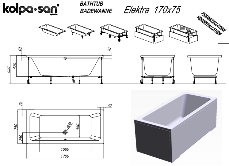 1) Ванна акрилова Kolpa San Elektra 170х75 см/О з комбінованою (повітря+вода) масажною системою та панеллю білий