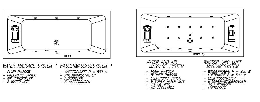 Всі елементи системи водно-повітряного масажу об'єднані у комбіновану систему. Одночасна діяльність обох систем інтенсивно впливає на організм людини, повністю регенерує та розслаблює його. Система аеромасажу працює за рахунок повітряного насоса, що створює підвищений тиск і потік повітря через масажні форсунки. Струмені розбивають повітря на дрібні бульбашки, які змішуються з водою і своєю кінетичною енергією інтенсивно масажують тіло.