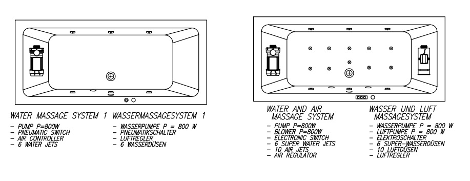 Всі елементи системи водно-повітряного масажу об'єднані у комбіновану систему. Одночасна діяльність обох систем інтенсивно впливає на організм людини, повністю регенерує та розслаблює його. Система аеромасажу працює за рахунок повітряного насоса, що створює підвищений тиск і потік повітря через масажні форсунки. Струмені розбивають повітря на дрібні бульбашки, які змішуються з водою і своєю кінетичною енергією інтенсивно масажують тіло.