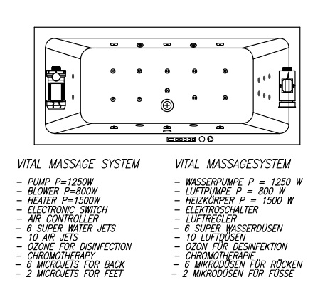 Зібрана ванна на каркасі зі зливом-переливом із встановленою панеллю та масажною системоюVITAL.