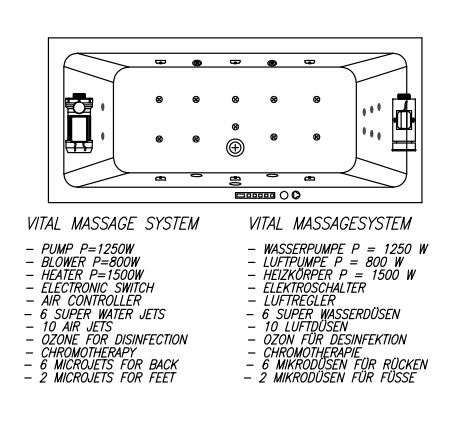 Зібрана ванна на каркасі зі зливом-переливом із встановленою панеллю та масажною системоюVITAL.