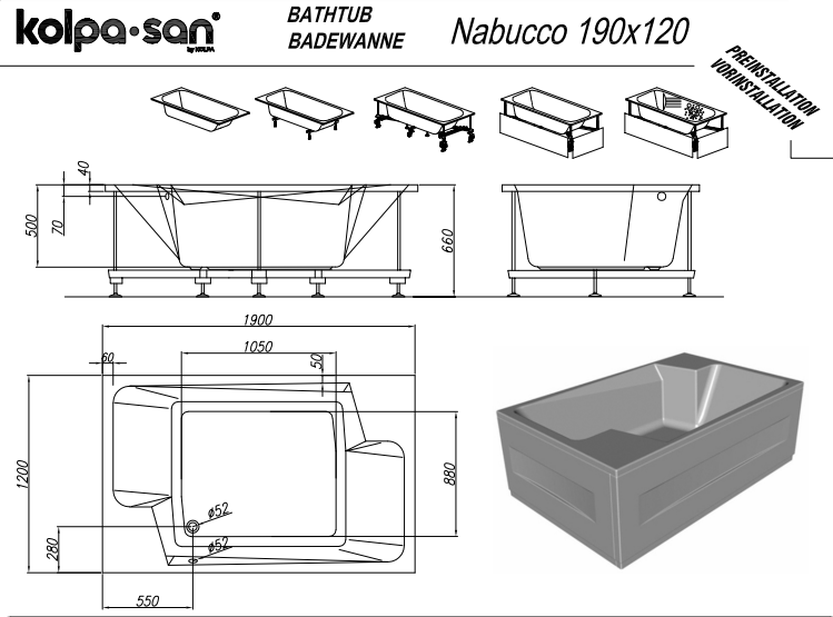 1) Ванна акрилова Kolpa San Nabucco 190х120 см/О прямокутна з панеллю білий