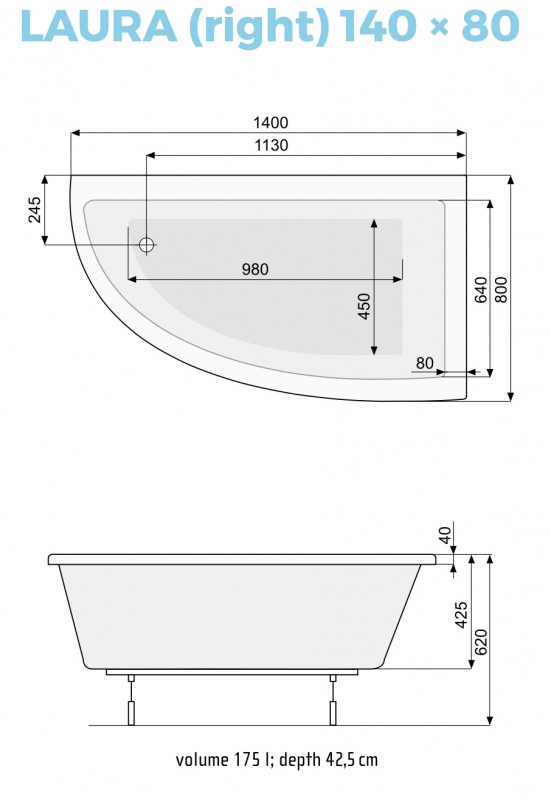 Акрилова ванна PoolSpa Laura 140х80 асиметричної форми має середні габаритні розміри. Незвичайна форма ванни, схожа на акуратно обрізаний прямокутник, причому довга сторона зроблена невеликим радіусом, що додає м'якості всієї конструкції. Зливний отвір ванни розташовано в самій вузькій її частині. Широка кромка підкреслює незвичайність форми і служить надійною опорою для установки пульта управління гідромасажними системами. Досить довге і широке дно ванни дозволяє відчувати себе вільно.