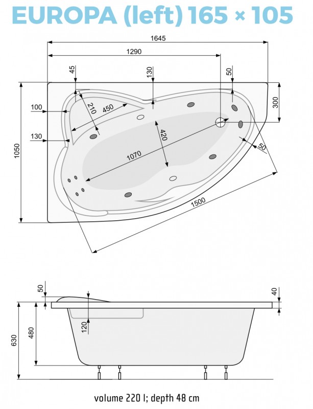 Виробник виготовляє дану ванну як правостороннім, так і лівосторонній, а також, опціонально рекомендує, її комплектувати передньою панеллю. Дана ванна йде в комплекті з опорною рамою.
