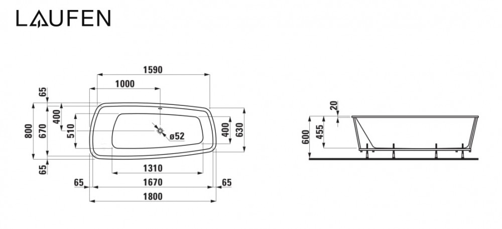 Ванна акрилова Laufen Palomba Collection 180х80 см вбудована асиметрична білий H2428010000001