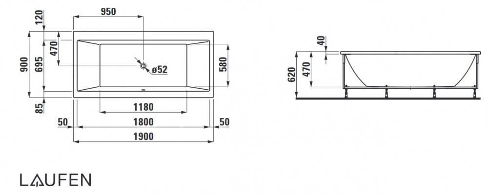 Ванна акрилова Laufen Pro 190х90 см вбудована з LED-підсвічуванням прямокутна білий H2349510006151