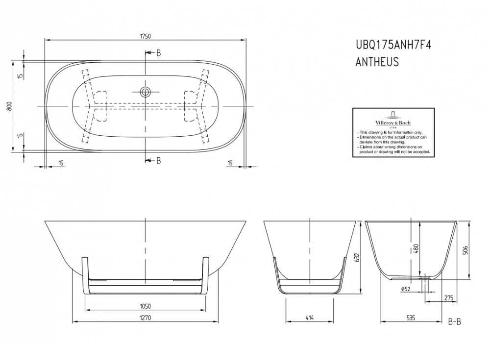 1) Ванна акрилова окремостояча Villeroy & Boch колекції Antheus 175x80 біла UBQ175ANH7F400V