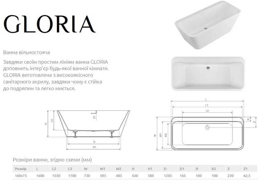 Ванна акрилова Radaway Gloria окремостояча 160x73 см білий WA1-54-160x073