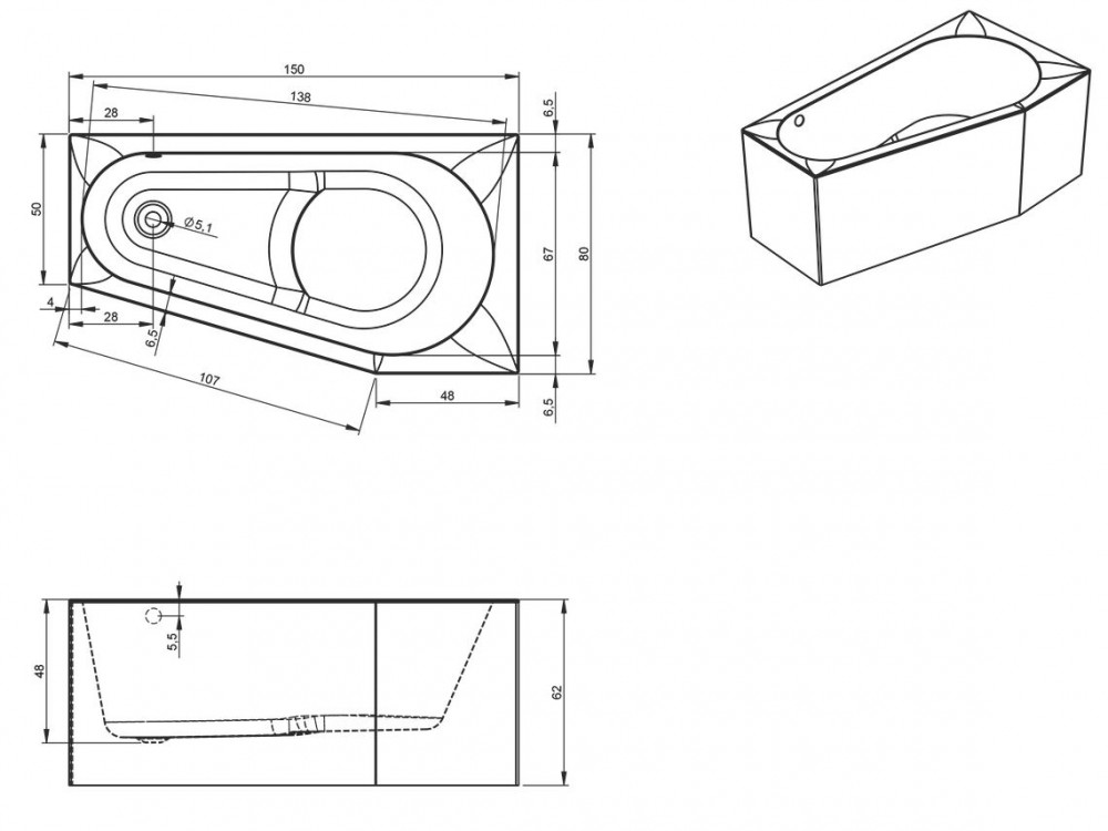 1) Ванна акрилова Riho Delta Plug & Play асиметрична 150x80 ліва з панеллю