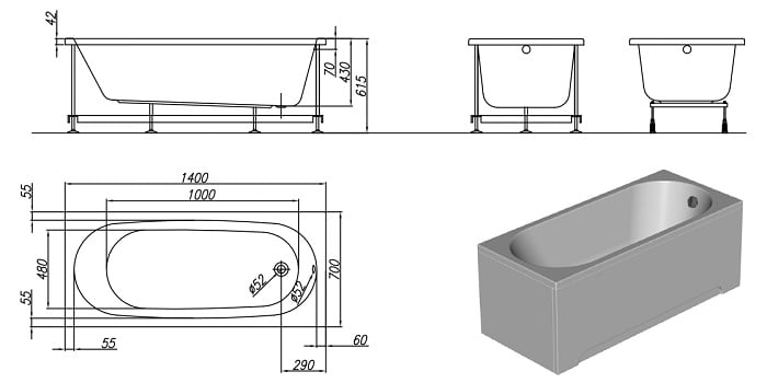 1) Ванна акрилова вбудована прямокутна Kolpa-San Tamia 140х70 см білий