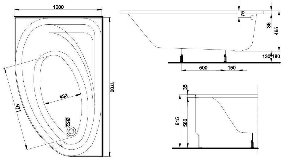 Ванна акрилова асиметрична Kolo колекція Spring 170х100х46.5 + Ніжки SN7 + Сифон Geberit левосторонняя XWA307100G