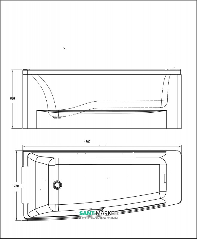 Ванна акрилова асиметрична Volle 170х75х63 біла TS-102 / L