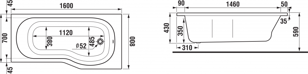 1) Ванна акрилова Jika Tigo 160х80 см асиметрична під панель права