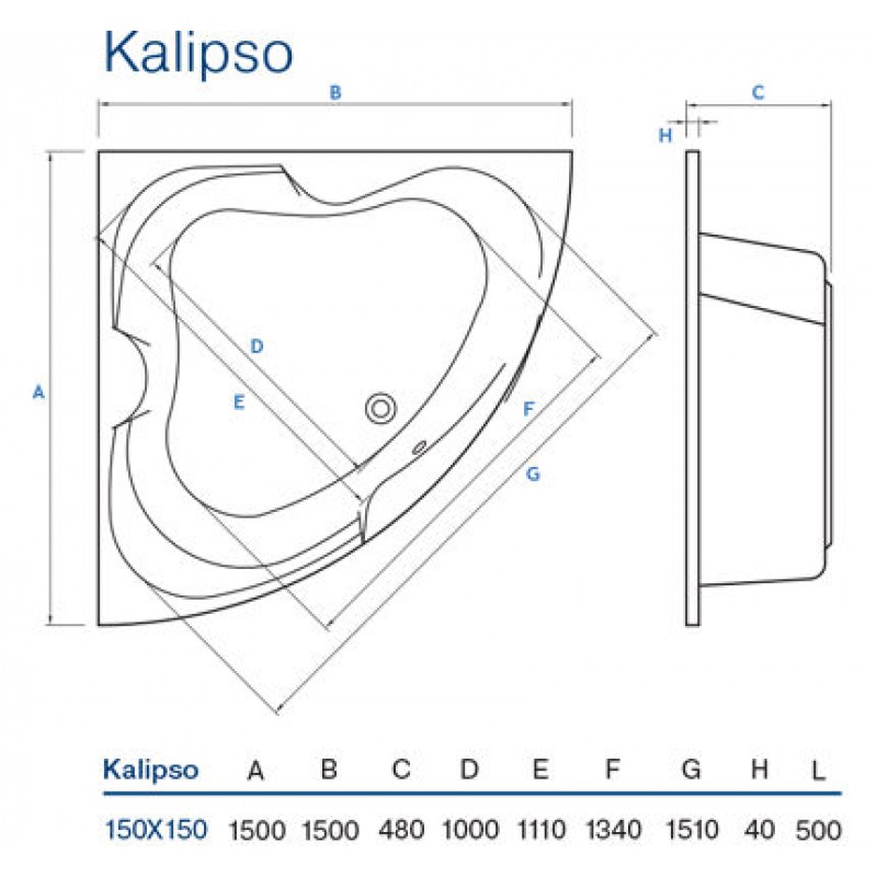 Акрилова ванна Koller Pool Kalipso 150x150 - ванна кутовий форми, а відміну від асиметричних, вона більш універсальна адже встановити її можна в будь-який кут вашої ванної кімнати. Другою перевагою кутовий ванни є те що в ній досить місця для того щоб приймати ванну удвох, насолоджуючись спілкуванням один з одним після важкого робочого дня. А якщо у вас є діти, безсумнівно їм сподобається власний міні басейн у ванній кімнаті. Володіючи сучасним дизайном і строгою формою, вона ідеально впишеться в дизайн будь-якої ванної кімнати.Головне, щоб ванна кімната була досить великою і могла вмістити ванну таких розмірів. Додатково можна придбати панель фронтальну панель, а також встановити гідромасажну систему.