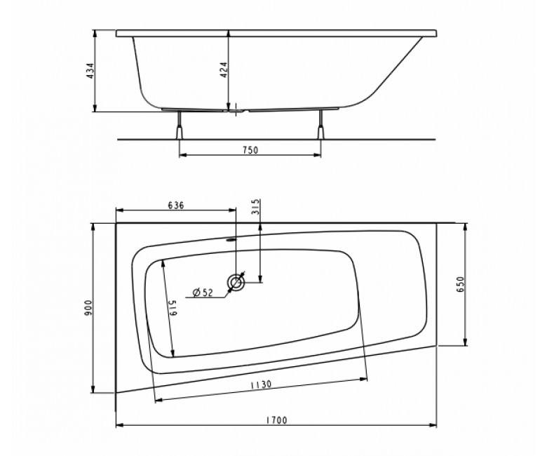 1) Ванна акрилова Kolo Split асиметрична ліва 170х90 см білий