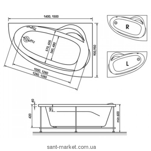 Ванна акрилова кутова асиметрична Koller Pool колекція Boston L 150х95х44