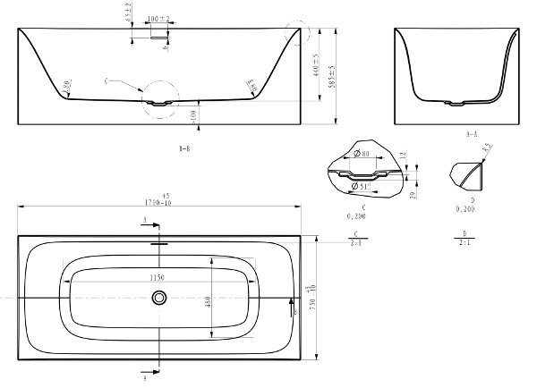 Ванна акрилова окремостояча Volle 170х75 з лицьовою панеллю і сифоном cliсk-claсk біла