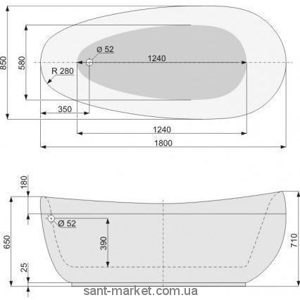 Дана ванна акрилова, овальної форми, що окремо стоїть. Злив-перелив із донним клапаном Click-Clack у кольорі хром входить до комплектації ванни.
