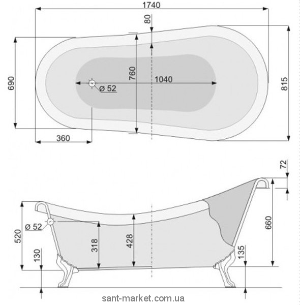 У районі спини ванна зроблена більш високою, ніж у решті частин, що дозволяє комфортно розміститися. Незважаючи на зовнішню витонченість, ця ванна досить містка, її об'єм становить 210 літрів. Висота конструкції в найвищій точці 80 см, найнижчій 56 см, що дозволяє без зайвих зусиль заходити і виходити з ванни.