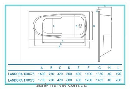 Ванна акрилова прямокутна Koller Pool колекція Landora 170х75х45