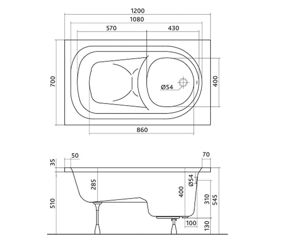 Прямокутна акрилова ванна Kolo Diuna з ніжками в розмірі 120х70 см. Базова комплектація ванни поставляється без передньої панелі та системи зливу-переливу.