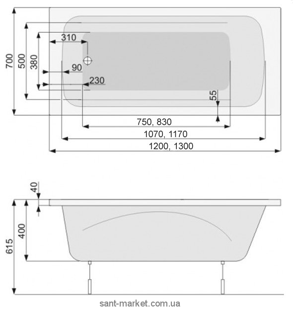 Акрилова ванна без гідромасажу в комплекті з ніжками. Додатково купується слив-перелив.