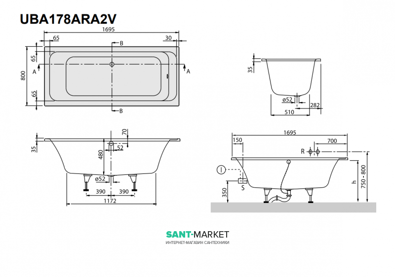 Ванна акрилова прямокутна Villeroy & Boch Omnia Architectura 170х80х48 UBA178ARA2V-01