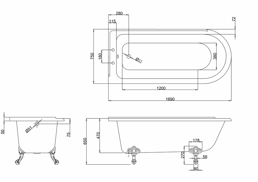 1) Ванна акрилова пристінна Burlington Hampton правобічна 169x75 см білий
