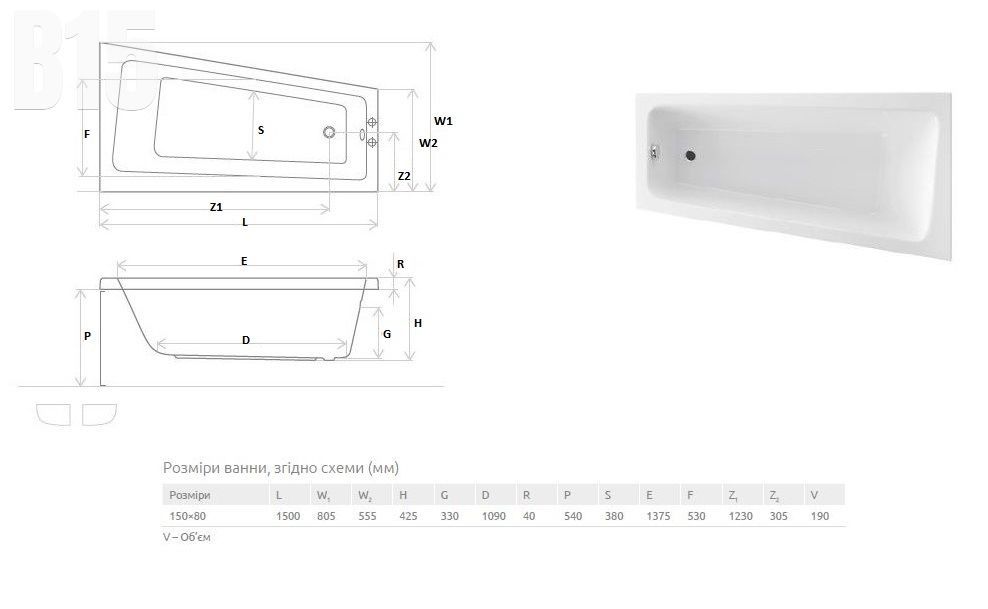 1) Ванна акрилова Radaway Evia 150x80 см права з ніжками білий