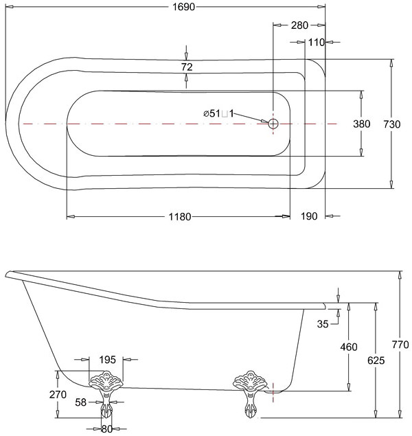 1) Ванна акрилова свободностоящая Burlington Harewood Slipper 169x73 см білий
