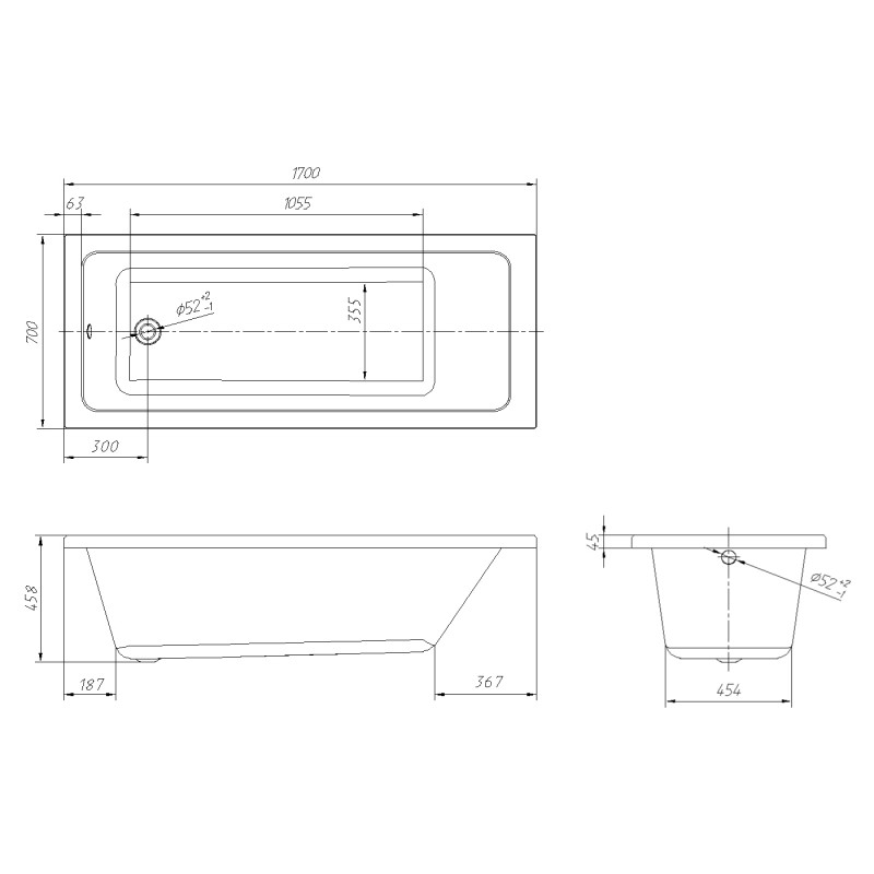 Пристінна прямокутна, акрилова ванна серії Libra, що має габаритні розміри 170 x 70 x 45.8 см і поставляється без ніжок, сифона і панелі (купуються окремо)