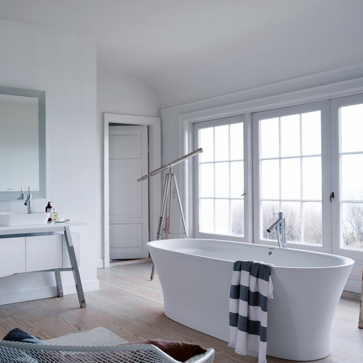 Півострів Cape Cod в Новій Англії на східному узбережжі США відрізняється незрівнянним колоритом. Цей край з його кілометровими піщаними берегами, кришталевої водою і незайманою природою надихнув Філіпа Старка і фірму Duravit на створення Cape Cod - нової серії ванних кімнат. Точно так же, як умивальник і меблі, ванна Cape Cod об'єднує матеріал і форму в нове, інноваційне єдність. Ванна виготовлена з нового матеріалу фірми Duravit - DuraSolid, який дозволив у всіх деталях втілити проект Старка: особливі філігранні краю ванни,органічні форми, м'які вигини. За винятком опори для голови, вбудованої в задній скіс, ванна монолітна, а її поверхня шовковисто-матова і приємна на дотик.