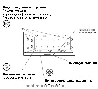 6 регульованих бічних форсунок (водно-повітряні), 12 на дні ванни (повітря)