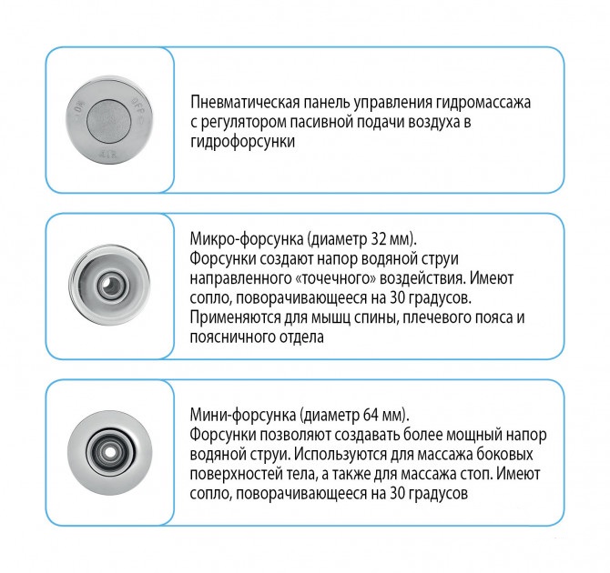 Міні-форсунка (діаметр 64 мм). Форсунки дозволяють створювати більш потужний натиск водяного струменя. Використовуються для масажу бічних поверхонь тіла, а також для масажу стоп. Мають сопло, що повертається на 30градусів - 6 шт .;