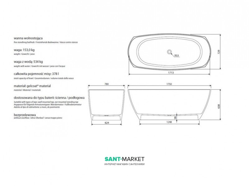 Ванна кам'яна окремостояча Marmorin Isar біла P 599 170 020 010