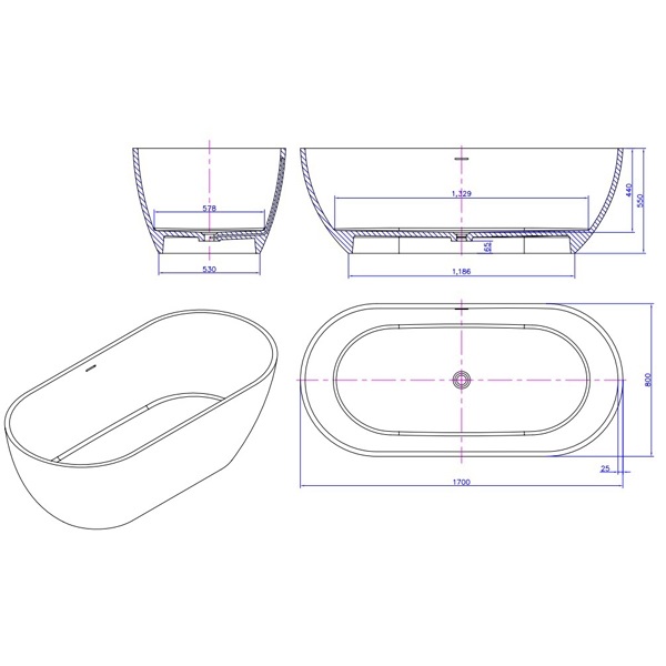 1) Ванна кам'яна окремостояча овальна Istone Diva 170х80 см білий матовий