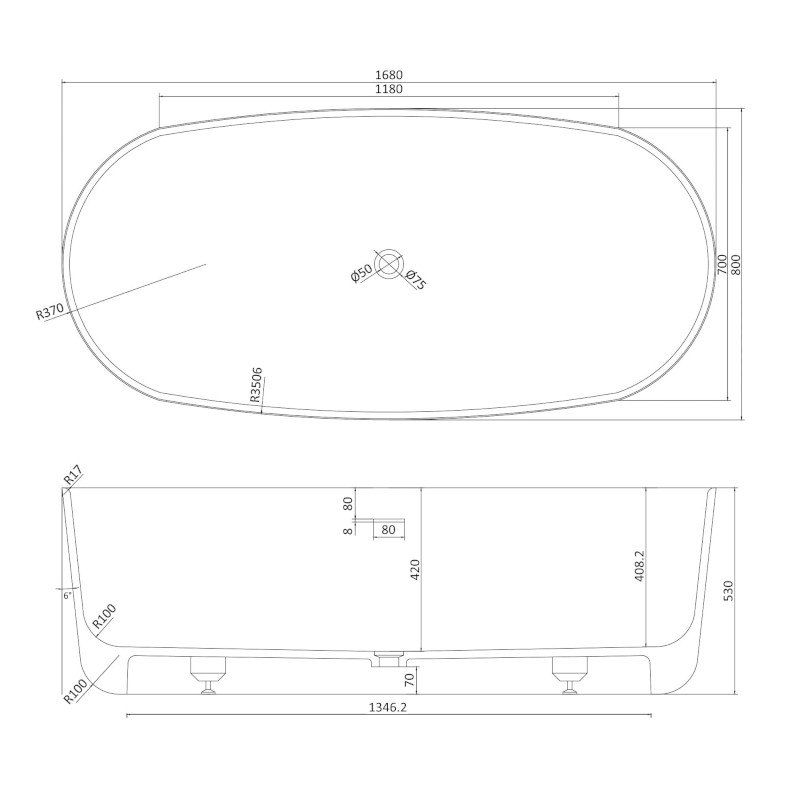 1) Ванна окремо стоїть кам'яна Volle Solid surface 168х80 білий