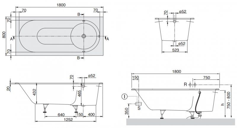 Комплект ніжок для ванни (самоклеящихся) входить в поставку, регулюються в діапазоні 130 до 180 мм ..