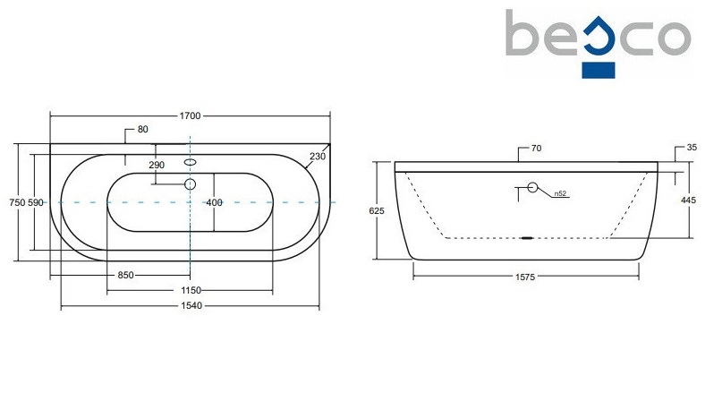Ванна зі штучного каменю Besco Volya 170х75 см із сифоном клік-клак хром санітарний композит білий глянсовий #WKV-170-WS