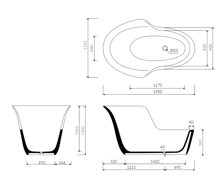 1) Ванна з штучного каменю Marmorin Jena 190х115,5 см окремостояча білий