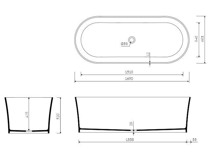 1) Ванна зі штучного каменю Marmorin Wega 169х68,5 см окремо варта білий