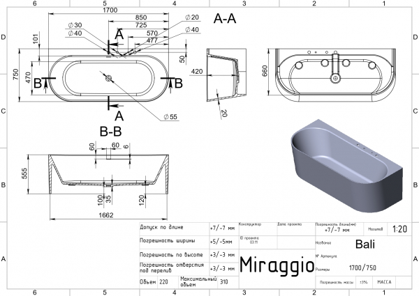 Ванна із штучного каменю Miraggio Bali 170х75 см Mirasoft Technology перловий матовий 0001684