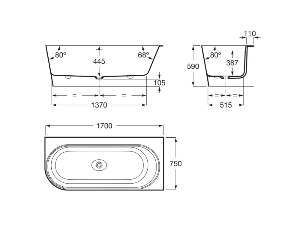 Ванна з штучного каменю Roca Raina 170х75 см кутова права Stonex білий/чорний A2486670K0