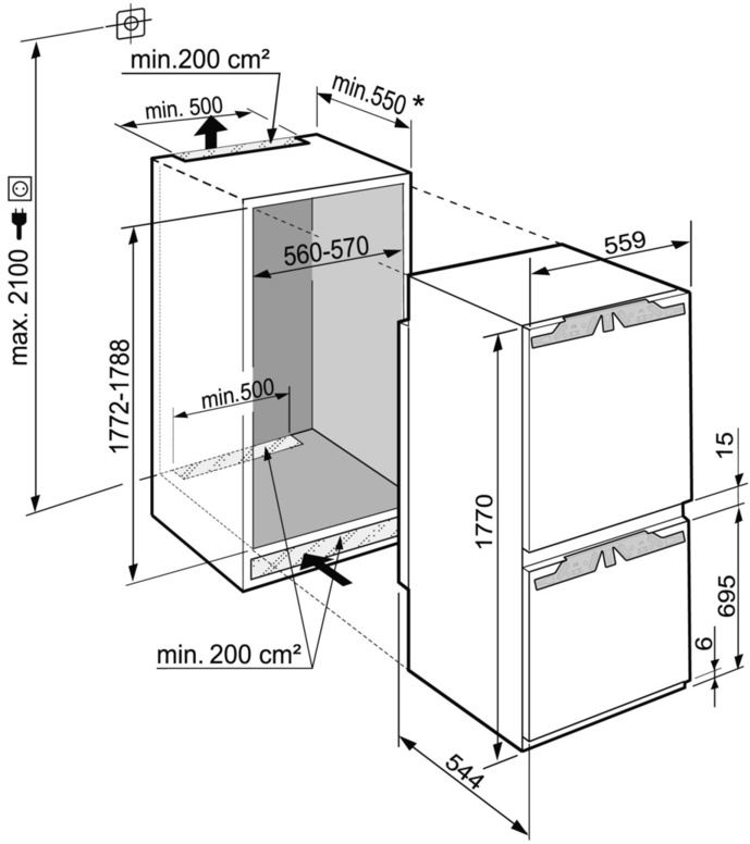 Холодильні камериможна без зусиль розмістити за фасадом кухонного гарнітура, завдяки чому вони будуть прекрасно гармоніювати з Вашим кухонним гарнітуром. При цьому необхідно дотримуватися технологію монтажу вбудованої техніки. Монтаж фіксованою дверцят: меблева дверцята і дверцята приладу кріпляться один до одного, при цьому меблева дверцята кріпитися безпосередньо на дверцята холодильника. Монтаж буксируемой дверцят: Меблева дверцята закріплена безпосередньо на високому шафі і з'єднується з дверцятами холодильника за допомогою ковзної шини. При відкриванні та закриванні меблева дверцята ковзає уздовж шини.