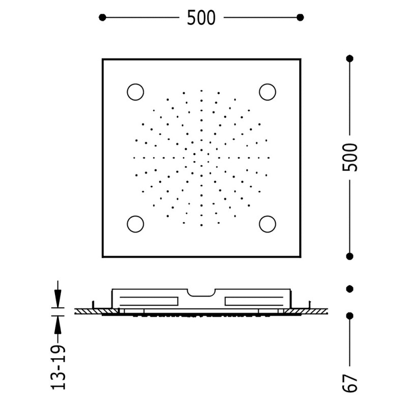 1) Верхній душ Tres Inox 500х500 мм хромотерапия хром