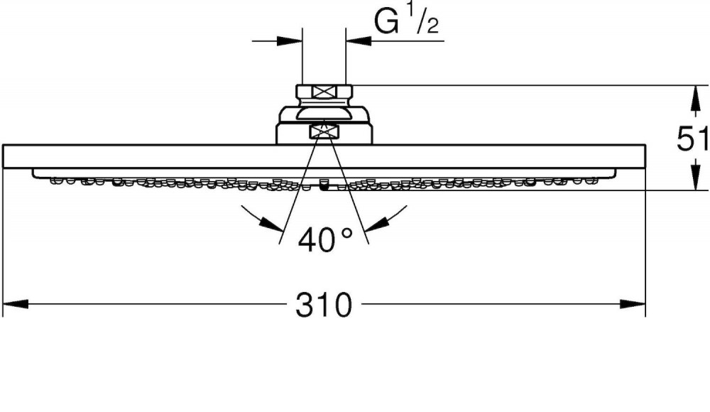 Rainshower® Cosmopolitan 310 Верхній душ з одним режимом душовий струмінь Rain Ø 310 мм метал шаровий шарнір з кутом повороту 20° ± 20° різьбове з'єднання 1/2" GROHE EcoJoy® обмежувач витрати води 9,5 л/ чудовий потік води GROHE StarLight® хромована поверхня із системою SpeedClean проти вапняних відкладень може використовуватись із проточним водонагрівачем.